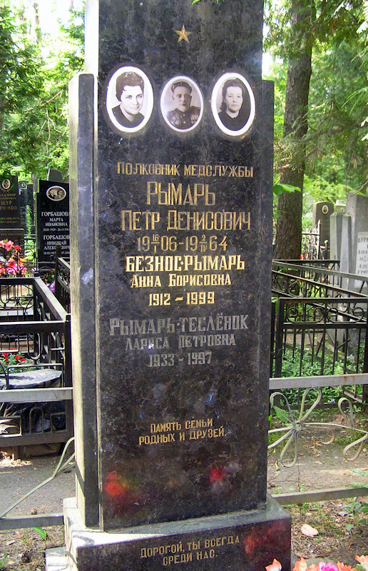 Вот тоже интересно – семья Алексютовичей. Отец – балетмейстер, дочь – заслуженный деятель искусств Беларуси, а сын – инженер-подполковник. Причем, судя по памятнику, именно благодаря нему вся семья лежит на этом кладбище и в центральном секторе.