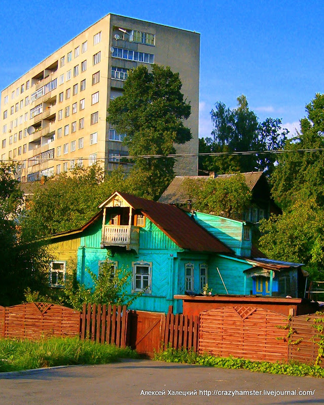 Вот домик, как пример такой частной застройки, на фоне многоквартирного дома. Обратите внимание на милый балкончик: