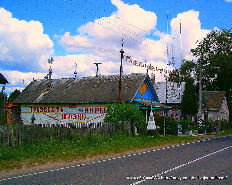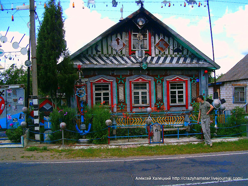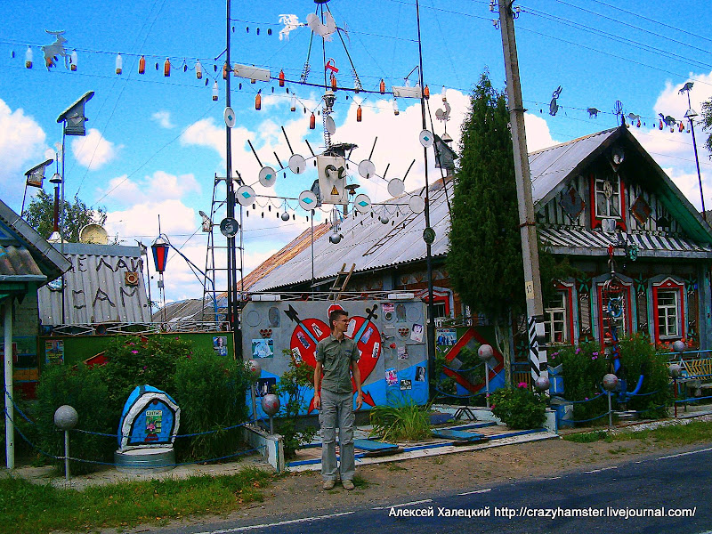 Больше в Березино нет ничего интересно и мы, довольные, что недолго пробыли в этом городе, поехали дальше. Но сначала мы умудрились заблудиться и проскочили поворот на трассу Минск-Могилев. И слава богу! Ведь иначе мы бы не увидели прекрасный образчик современного белорусского искусства. Первым этот домик заметил Андрей, за что ему честь и хвала. А когда мы остановились и вышли на него посмотреть, то цветовое разнообразие чуть не выжгло нам сетчаку глаз. Судите сами: