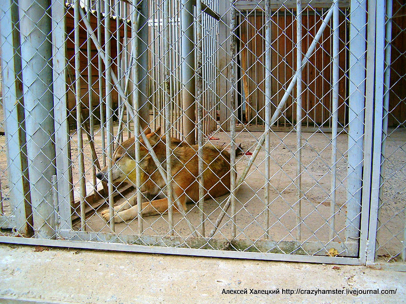 В клетках большинство животных предавалось обеденному сну, да и погода была жаркой - разморило. Кормят их там очень хорошо. Вот, например, волк, который даже не стал есть все мясо, что ему дали (валяющиеся куски мяса видны за ним). Я слышал, как женщина, проходя мимо клеток, все сокрушалась, что животным дают такое хорошее мясо: