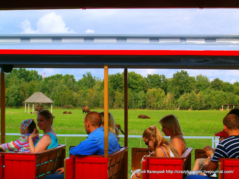 Два-три месяца назад по зоосаду был пущен обзорный паровозик, который везет посетителей по 2-километровой железке. На конечной остановке бродят непуганые зубры: